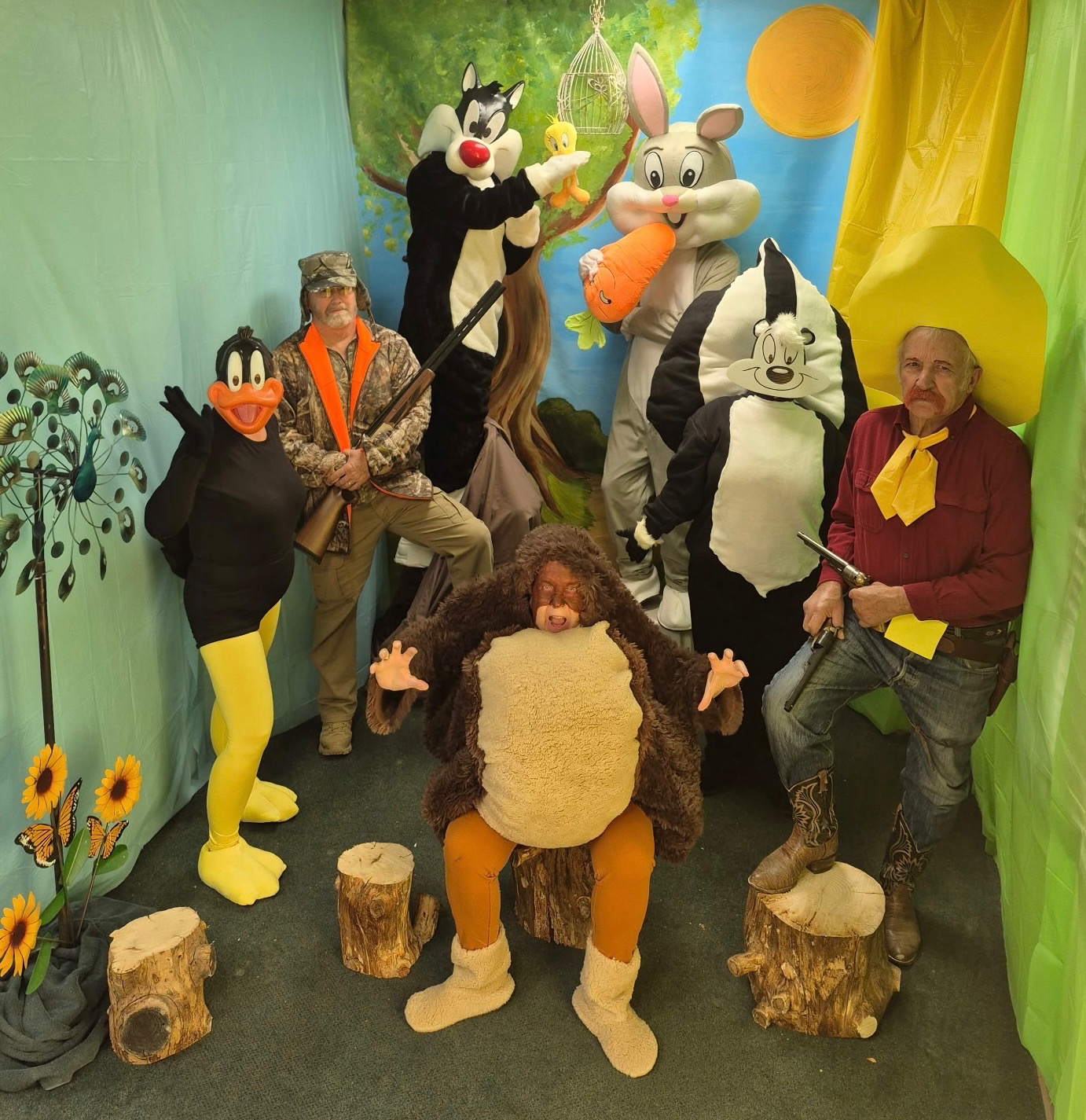 It may be "Hunting Season," but what a beautiful day to play in the park! All the Looney Tunes are here. Bugs Bunny is hanging out with a carrot in hand while Elmer Fudd and Yosemite Sam keep their eyes and guns aimed his way. There is no need to worry, though. Bugs' has his friends Daffy Duck, Pepe' Le Pew as well as Sylvester the Cat and Tweety Bird close by. In any case, if they need assistance, Taz is always ready to "eat them up and spit them out"! The hunters will not succeed!
